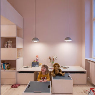Eine über zwei Etagen gehende Gartenhauswohnung eines Berliner Jugendstilhauses war sanierungsbedürftig und konnte einer fünfköpfigen Familie nicht mehr ausreichend Platz bieten. Durch ein individuell entwickeltes Raumsparkonzept und einen maßgeschneiderten, intelligenten Innenausbau wurde die 100m2 Wohnfläche optimiert und ein drittes Kinderzimmer generiert.